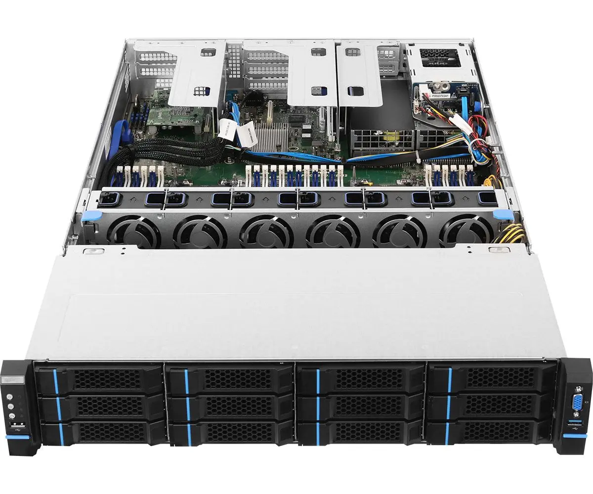 - High-Capacity Storage: Equipped with 12 hot-swap 3.5″/2.5″ bays in the front and 2 hot-swap 2.5″ bays in the rear.